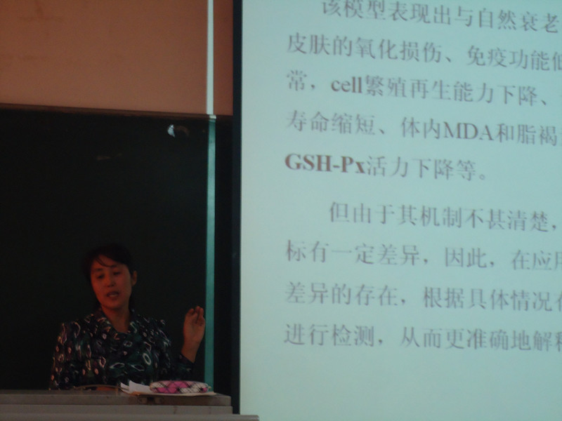 陈艳珍教授首先就《复合微量元素对衰老小鼠作用的研究》进行了汇报。陈艳珍教授就什么是“衰老”这一问题开始了此次学术报告。衰老是体内外因素共同作用的结果,是一种连续性的、普遍存在的、进行性的、内在的,且具有破坏性的、不可逆转的生理过程。目前,学术界针对衰老和抗衰老机理研究,主要是寻找一种高效、安全可靠的抗衰老方法,在衰老生物学和老年医学研究领域就其学术价值二比较受认可的有几十种学说,最终可以归结为两大学说,一是损伤积累衰老理论,二是基因程序理论,这两种学术理论均有一定的实验基础,但是也存在着较大的局限性,因为这两种学说都只是从一个方面进行了阐述,现代科学研究表明,只有将这两种学说有机的结合在一起才可以得出较为中肯的理论。除生活习惯、锻炼方法外可以对机体衰老起到一定作用外,长寿基因和和衰老基因研究以及抗衰老制剂研究均可以为机体衰老起到一定的作用。紧接着,陈艳珍教授向参与报告会成员介绍了几种常见的衰老动物模型,主要可以分为自然衰老动物和人为因素致衰老的动物为模型。常用人为因素致衰老动物模型造模方法大约有四种,如D-gal致衰老模型就是大剂量的注射D-gal,致使被还原成半乳糖醛醇和H2O2并在这一过程中产生超氧离子,逐步引起cell中脂质、蛋白质氧化应激而使细胞产生障碍。这种致衰老模型是我国科学家最为常用的衰老模型,同时在国际上也受到极大认可。随后,陈艳珍教授又讲解了快速老化小鼠(SAM)模型、小型鱼类衰老模型、果蝇衰老模型,这几种衰老模型各有其优缺点,需要科研人员在实际操作中针对不同方面科学的选取衰老模型。陈教授着重阐述了复合微量元素对D-gal诱导衰老小鼠作用的研究,机体中常见SOD/GSH-Px、CAT等抗衰老酶系。其中SOD随着年龄的增长活性不断降低。实验目的主要是复合微量元素对抗衰老、抗氧化、抗血脂方面的作用。实验全程共56天,通过负重游泳测试、眼底采血、测定血清尿素氮等方法得出适量补充微量元素对衰老小鼠的抗衰老以及抗疲劳有着显著的作用,同时据国外文献表明长期服用复合微量元素制剂会造成中毒以及药物依赖,因此建议大家以调节饮食方法来补充维生素、微量元素最为适宜。
