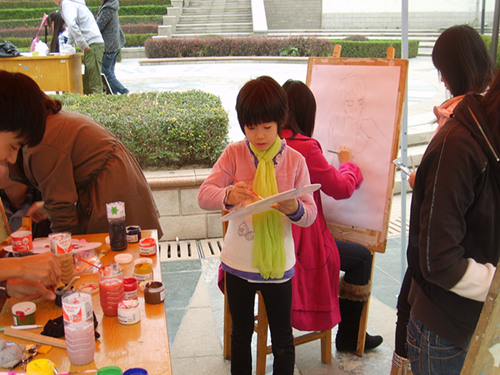 活动伊始,阴暗的天空给此次活动蒙上一层阴影,本以为恶劣的天气会影响参赛者的热情,但结果却出人意料。早早的,动漫社的骨干成员就来到老员工艺术广场布置场地,随着一顶顶帐篷的立起,一块块画板的摆放,预示着此次活动正式拉开帷幕。参赛选手各自组队,有的是老朋友,有的素未平生,但各自分工明确,有条有理。在众多参赛选手中,一位小朋友的身影吸引了我的目光,据悉这位小朋友是位小员工,由于对本次活动十分喜爱,特意赶来参加,看着她专注的神情与脸上的欢笑,让人不经回想起童年的快乐。