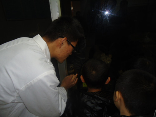 活动中,100余位小朋友被分成5组轮流进行参观。随着首批20位小朋友进入标本室,各位讲解员立刻进入角色,亲切的与小朋友交谈,并指引小朋友参观。在介绍过程中,小朋友们提出各种问题“这个是什么?”,“这个字怎么念?”,“为什么它们都在水里?”讲解员们耐心的为小朋友一一解答。整个过程中,小朋友们时而疑惑,时而惊奇,时而开心的表情深深感染了每一位讲解员。