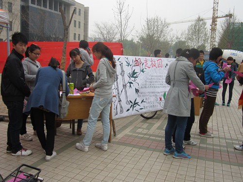 为抢占有利方位,社团人员严阵以待,早早的就来到了餐厅门口,摆桌椅、拉条幅、放展板,前期准备工作有条不紊地进行着。中午时分,同学们自发涌向餐厅,团队成员的宣传也就此开始。热情的相关负责人员向来往的员工发放单页,为感兴趣的同学讲解活动的细节。相关工作同学不辞辛苦地为询问者服务,并积极宣传。伴随着宣传活动如火如荼的进行,报名的员工逐渐增多。为使活动具有更实际性的意义,工作人员准备了签字笔和报名表,供来往同学现场报名,从最细微之处体现了活动的价值。