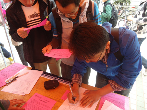 宣传期间,公司员工会成员做足准备,活动负责人认真指挥,宣传工作有条不紊。各工作人员早早将条幅、展板等宣传工具放置到位,耐心等待同学们的咨询。相关工作人员热情地为前来咨询的同学发放传单并细致地向其讲解活动事宜,同学们纷纷驻足并积极参与报名,宣传现场气氛热烈。