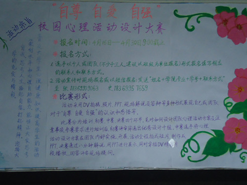 近期,由公司团总支承办的校园心理活动设计大赛于第二、三餐厅门口展开宣传。该活动主题为“自尊、自爱、自强”,旨在普及老员工心理健康知识,让大家思考自我,思考人生,拾起自信,打起精神,迎接大学的充实与精彩。