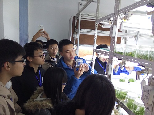 2点30分,生命家园成员集合完毕,进行参观前的最后准备。之后半小时,参赛同学陆续到达,进行登记后,开始了实验室之旅。首先参观的是位于一楼的发酵工程室,实验室老师向同学们介绍了从葡萄脱粒、发酵到装瓶全过程所需的仪器的使用方法,并说明了酿造过程中的注意事项以及发酵周期,老师还特地打开装瓶设备演示装瓶过程。老师在讲解了葡萄酒的品鉴方法后,还让同学们试着品尝实验室酿造的葡萄酒。之后,在二楼的动植物标本室,同学们对标本表现出极大的兴趣,围在标本周围讨论着它们的种类、制作方法之类的问题,并请讲解员同学详细讲解。稍后,学长讲解了植物标本的制作方法,同学们认真听讲,仔细记录。走出标本室的时候,同学们还在兴奋的讨论着所见所闻。然后是位于三楼的组织培养室,实验室的架子上陈列着位于组织培养各时期的植物。同学们自由提问,学长一一解答他们的疑惑。在自由活跃的气氛中,同学们了解到了培养基的成分,组织培养的优点及应用,培养过程中的注意事项等等的知识。最后参观的是同样位于三楼的离心机室。在离心机室,同学们看到了各种离心机并且了解了作用和使用方法。