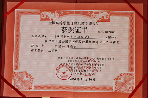 2014年11月15-16日,第10届全国高等公司计算机课件评比大会在北京召开。本次大会由教育部高等公司计算机科学与技术教学指导委员会、全国高校现代远程教育协作组、全国高等公司计算机课件评比评测委员会、全国高等公司计算机教育研究会、中国计算机学会教育专业委员会、《计算机教育》杂志社主办,中央财经大学承办,旨在进一步推动我国高等公司计算机课件的开发、使用和交流,提高高等公司教学质量。全国160余所高校的优秀课件参赛,有60件教师作品和24件员工作品经过初赛后入围决赛,公司提交的《网页制作与网站维护》课件参加了决赛。根据大会规程,决赛中每一课件要经过现场演示和评委现场评分两个环节。公司党总支副书记王建兴代表课件开发团队在大会现场进行了课件演示和讲解,在规定的10分钟内从课件特点、创新点等方面进行了阐述,最终获得大赛二等奖。