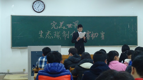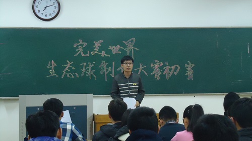 比赛伊始,主持人向各位参赛选手及观众介绍了本次比赛的主旨——提高同学们的环保意识,让同学们在构建和观察“微型生态系统”的过程中加深对生态系统的理解。随后主持人宣读了本次比赛的基本流程,包括比赛制度、初赛内容、评分标准、策划案演讲等。初赛正式开始,各参赛队伍选派一名代表进行了限时三分钟的现场演讲,阐述各自的策划方案,同时也将参赛的理念与对生态系统的思考一并传达给其他人。限时演讲结束后,安老师对此次比赛中选手们的表现进行了细致而又有针对性的点评;对此次比赛给予好评和肯定,她表示这次比赛同学们的想法都很好,也让她增长了颇多的见识。最后主持人宣布了各队的初赛成绩,按分数排名,共有12支队伍成功进入决赛环节。