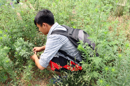 同学们前往孝妇河采集艾蒿。孝妇河旁杂草丛生,齐腰的杂草给同学们来了一个下马威,要在成群的杂草中寻找艾草谈何容易,加上很多同学根本就不认识艾蒿,给采集工作造成了更大的困扰。但是同学们结合专业优势,通过查阅文献资料很快掌握了艾蒿的形态特征,加上有经验的同学在一旁指导,很快就掌握了辨别艾蒿的要领。同学们在齐腰深的草丛中仔细寻找艾蒿的踪影,一心想着为同学们带去祝福,被杂草树枝划伤也浑然不觉。每当发现新的艾蒿从,同学们都如获至宝,当然在采集过程中也注重保护自然环境,不会采走全部的艾蒿,使其可以繁衍生息。
