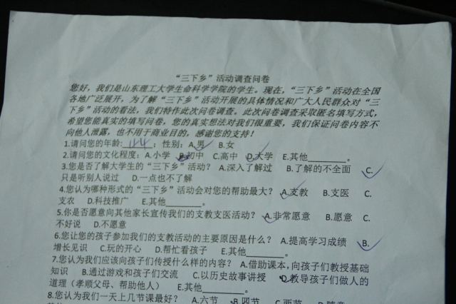 7月21日上午,对这些问卷进行调查,我们发现对于当地居民来说,三下乡活动中最有利于他们生活的是支教支医,他们大多数人都很支持我们当下开展的支教活动,并且看重的是通过支教开阔孩子们的知识面,在他们小学时候就帮他们打开一扇看世界的视窗。