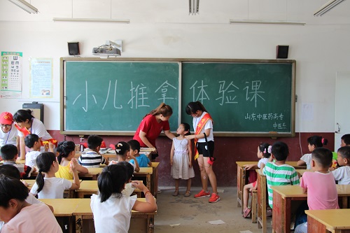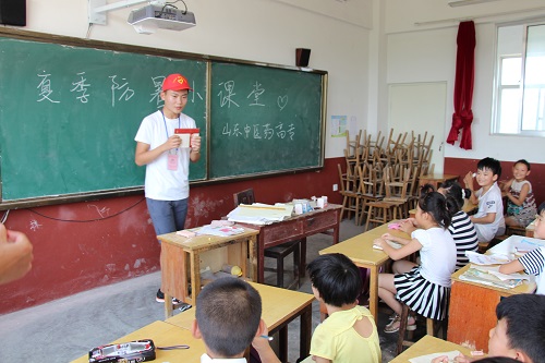 一二年级的教室里,山东中医药高专的志愿者们首先向同学们介绍了几种简单的医疗药品和医疗工具并讲解了它们的基本用法。在介绍完毕后,同学们都举起了手表示想要亲自动手操作。两个实践团队的成员也耐心地向孩子们讲解在操作过程中的注意事项。而在三年级的教室里,山东中医药高专的志愿者们向同学们介绍了夏季防暑的技巧和中暑之后应该如何施救。同学们听得非常认真,不时地就听不懂的地方提出自己的问题。每一个同学都获得了老师奖励的小红花和防蚊贴。在课程结束之后,距离放学还有一段时间,同学们在老师的带领下玩起了击鼓传花,鼓声结束后手握毽子的同学就要上台表演一个节目。同学们有的背诵古诗,有的唱歌,有趣的表演逗乐了很多人。同学们放学后,两个团队的成员交流了自己在实践过程中的发现、感悟、心得,并拍照留念。