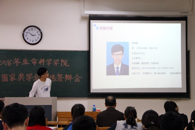 答辩开始,翟静涛上台,向大家介绍了国家奖学金的申请资格以及评选的规则。随后王建兴也给同学们普及了在答辩过程中可能会出现的专业名词,方便同学能能够更好地理解竞选者答辩中的内容。准备就绪后,三位竞选者依次上台,结合PPT进行演讲,介绍自己在校三年时间里取得的成绩。优秀的学习成绩、丰硕的科研成果、出彩的获奖情况、丰富的社会实践经历引起了台下同学们的阵阵惊叹。同时,评委们也对竞选者答辩中的细节问题提出了自己的疑问。竞选者也认真地回答了评委提出的问题,同时把自己的优点和过人之处展现给了大家。