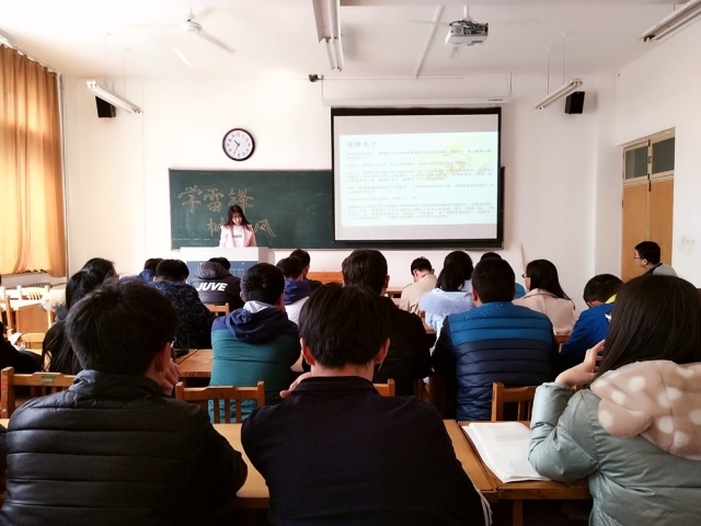 一部分同学在13号教学楼的201室举行“学雷锋 树新风”主题班会,在团支部书记张晓迪的带领下,团支部成员通过PPT的形式学习了雷锋的生平事迹,学习了雷锋精神的具体内容和雷锋精神对当代老员工的重要意义。
