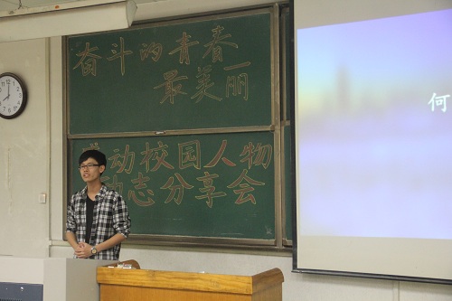 分享会伊始,感动校园人物曹书鑫向观众讲述了他的励志故事,上天带给他的磨难并没有摧毁他的意志,反而他却更加积极乐观的接受这些挑战,他以PPT的形式向同学展示了平时学习生活中的点点滴滴,并鼓励在场同学要坚强乐观,展现生命价值。接下来,ACM集训队成员代表陈元智讲述了他们团队的成长历程,从成立之初到获得金奖,他们团队一步步的发展壮大,每一次的参赛经历都给予了他们宝贵的经验,主讲过程中,在场同学认真聆听与交流。随后,王昊作为“太阳村”社会实践代表向在场同学讲述了在实践过程中带给他们特别印象的一些人与一些事,并抒发了自己对该实践的感慨与体会。最后阶段,郑兴和张瑞豪两位大四毕业生分享了他们的考研成功经验,作为考研模范张瑞豪提出了劳逸结合的重要性,郑兴则鼓励同学们要充满自信,相信自己,勇于接受挑战。