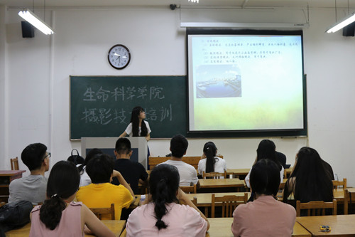 培训伊始,张守萍以ppt形式分别对摄影的定义、相机的基本构成、摄影用光、构图、校园新闻摄影等六个方面展开讲解。相机主要由镜头、机身装置、相机附件构成,每个结构又由小部分硬件组成。她详细讲解了机身装置,针对快门、光圈、调焦装置、取景器的定义、作用、分类及相关优缺点做详细讲解,这加深了同学们对相机应用方面的理解。