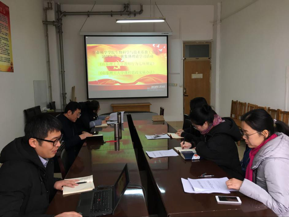 1月3日,生物科学与技术系教工党支部在支部活动室(341室)举行2018年第一次集体理论学习。公司党总支书记郭万保、系主任张月杰和支部全体党员参加学习。学习活动由支部书记谢文海主持。