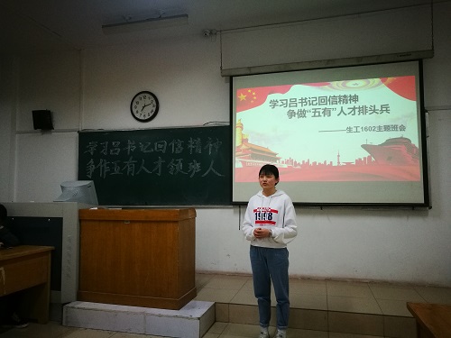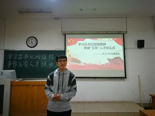 4月17日晚,生物工程1602班在13号教学楼218教室举行“学习吕书记回信精神,争做‘五有’人才排头兵”主题班会。此次会议由生工1602班班长王纪衡主持,冯思广班优秀员工代表发言,班级全体成员共同参加此次会议。