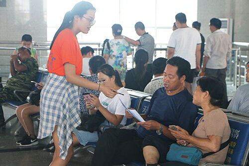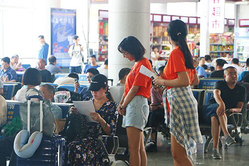 伴着广播中“请携带好您的随身物品,依次检票.......”的温暖女声,我们一行人整理好各自需要分发的调查问卷,开始了此次的调研活动。火车站候车室内,人声鼎沸,每个乘客都拿着大包小包的行李行色匆匆。我们怀着激动又忐忑的心情与站内乘客进行了沟通交流,但出乎意料乘客们为我们提供了很多宝贵的建议。