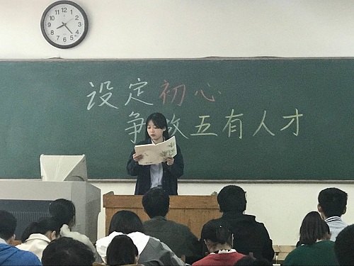 活动伊始,团支部成员以小组为单位进行演讲比赛。大家对各小组的演讲进行投票,票数较低的小组演唱校歌《你伴随我》。演唱过程中,感染了全体同学,并自发齐唱。随后,组织宣传委员通过PPT,对“五有人才”的含义进行解读,使同学们更深层次认识如何要求自己做好新时代的五有人才。另外,同学们进行初心上墙,将自己的四年目标写在便条上保存,寄希望于未来。接着,班长带领大家在逸夫图书馆前草坪进行了一系列有趣益智的小游戏,在锻炼身体的同时加强班级凝聚力。