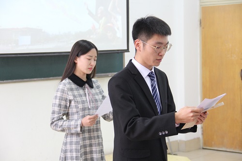 接下来,“冯思广班”全体成员进行诗朗诵《逐梦争锋》。通过朗诵,表现他们身为英雄后继者的光荣感,表明弘扬英雄精神的决心。比赛继续进行,氛围也是愈发紧张,后五位选手依次完成朗诵。活动最后,评委对后五位选手进行点评。其中,李海峰提到,朗诵时心态要放平稳,不能过于紧张,PPT的制作和背景音乐的选取对于朗诵的展示也非常重要。