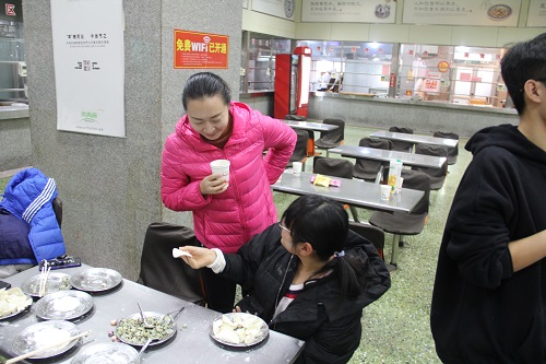下午3点整,包饺子活动正式在第二餐厅和第四餐厅拉开帷幕。到达餐厅之后,食堂工作人员已经为各班级准备面团以及饺子馅。简单布置后,到场的同学们纷纷捋起袖子,跃跃欲试。活动过程中,各班员工以小组为单位在一起包饺子,尽管当天气温很低,包饺子的材料很冰,手很冷,但是同学们还是克服重重阻碍,乐在其中。包饺子过程中,老师们积极参与,与同学一起擀饺子皮、包饺子,现场为不会的同学们演示如何包饺子。大家有的拿着手机拍照、录像,有的趁机把面粉抹在别人脸上,餐厅充满欢声笑语,成了一片欢乐的海洋。经过大家的不懈努力,一盘盘的热饺被端上餐桌,尽管它们的外形并不算漂亮,味道并不算顶尖,但是,当看到它的时候,洋溢在同学们心里的是满满的满足,那是全体同学共同的成果,是同学们相亲相爱的见证。大家一边吃一边交谈,气氛非常活跃。整个过程中,各班级还开展特色活动,如包饺子比赛、为班级导师过生日等。
