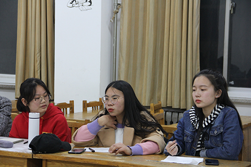 此次活动主要针对班级里近期的学习状况进行讨论。会议伊始,党丽峰及学习部的成员向新成员进行简要自我介绍,并说明此次活动的主要包含讨论各班级存在的学习问题,商讨建设良好的学习风尚的方法两方面的内容。另外,她积极鼓励各个班级的学委踊跃发言,真实准确反映自己所在班级学习情况,积极提出问题并集体解决问题。