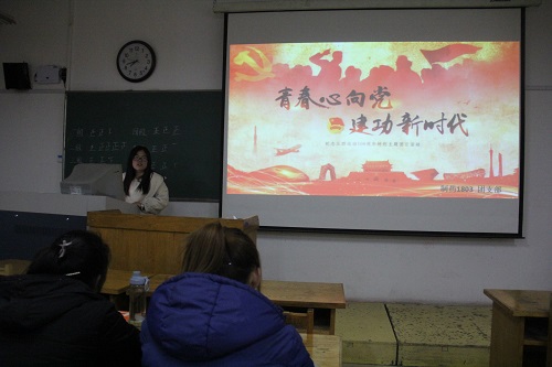 此次活动主题为学习党史知识,了解入党流程,激励和引领广大团员青年的爱国热情。活动伊始,团支书王彦梅简单介绍活动举办的背景,她说到,在今天建国70周年、五四运动100周年的日子,共青团中央展开“青春心向党,建功新时代”主题宣传教育实践活动。随后,王彦梅组织团支部全体成员宣读入团誓词,由国旗班的成员田宇进行领誓,团支部全体成员起立,郑重宣读入团誓言。接下来,王彦梅放映“抗日战争时期的青年员工风貌”的视频,引导团员青年大力弘扬以爱国主义为核心的伟大民族精神,直观地重现历史的形式,感受五四时期的青年爱国热情。另外,王彦梅组织同学们就如何成为一名光荣的共产党员展开介绍,她具体讲解入党申请的基本内容及格式要求,并鼓励团支部成员积极书写入党申请书。