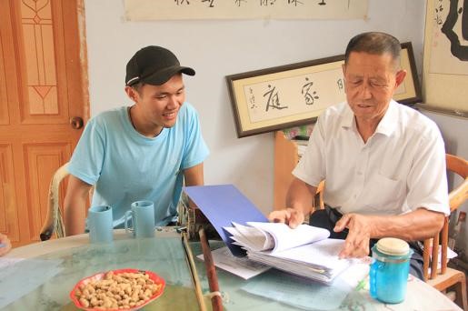 7月17日清晨,实践团来到夏津县后屯村拜访老人张显祯。他热情地招待队员们来到他的家中,并和实践队员分享他的人生经历和创作历程,之后,他拿出一本如视珍宝的歌词本,的歌词本被他翻的已是十分破旧,其中收录了40多首小调,歌词包涵了黄河故道的千年文化、采桑耕作、民间传说等丰富内容。