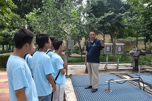 首先,实践团队来到细格栅间,颜廷东强调该部分在整个污水处理中起到的重要性,他说,格栅设计的设计是否切合实际,直接影响到整个水处理设施的运行。接着,实践队队员先后来到进水提升泵房、曝气沉砂池、缺氧池、厌氧池、生物池、二沉池、污泥浓缩池,颜廷东分别对各环节的工作原理、功能目标以及各环节之间的联系做详细介绍。在参观过程中,实践队队员都细心听取,并就污水的来源及成分、处理方法及成效、处理后污水的去向及用途等方面提出相关问题,颜廷东均一一耐心解答。据了解,污泥经脱水后,按照“减量化、稳定化、无害化、资源化”的原则,送入电厂焚烧处置,达到节能减排和循环经济的目的。最后,大家在出水排洪泵站看到经过处理后干净的水,实践队刘同学感叹道,“污水处理真的很不容易,一定要珍惜和保护水资源,不能轻易浪费。”