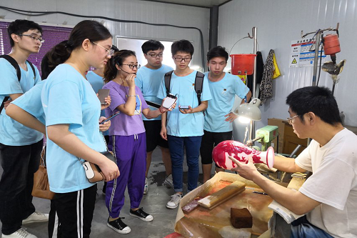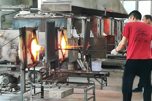 据介绍,雕刻要特别注意细节,因其精细程度具有不可逆性,若稍有不慎把图案刻坏,整个工作将前功尽弃。随后,实践团来到生产车间,炉工们从炉内取“料”后,迅速跑到制作台前进行加工塑性,手中的“琉璃料”像一道金光在快速移动中舞动闪耀。师傅通过调整合适的姿势用双手把握琉璃瓶的塑形,并将高温软化的琉璃以独特的图案画在琉璃瓶上。