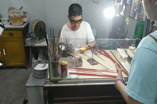 介绍员十分热情的带领实践团进入制作工坊,她讲到,西冶工坊其名来历颇有寓意,旧时博山以孝妇河为界,河东烧制陶器,河西冶炼琉璃,故而有西冶之名,西冶工坊是一家以工厂的形式销售和生产一体化的公司,已经注册为博山特色琉璃品牌,工坊建于2011年,工坊内老师傅们大多是来自老美琉厂的炉工、灯工,并且为了琉璃手艺的传承亦培养了忠于琉璃文化的年轻徒弟。工坊车间闷热嘈杂,琉璃匠人们于如此环境始终保持着对琉璃热爱的忠心,肩负着琉璃文化的传承。介绍员首先带领实践团进入琉璃制作间,可以看到师傅们皆一丝不苟,聚精会神的专注于自己的琉璃制作,介绍员先向实践团介绍了灯工,工艺师灯工以五彩六色、粗细不同的料条为材料,用氧气与液化气给玻璃棒加热(喷火嘴温度约在400℃至800℃),加热后的棒材融化变软。