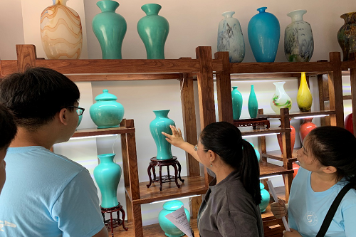 实践团到达了琉璃园并对园内店铺和康乾琉璃艺术馆进行采访,园内琉璃店主热心讲解了一些琉璃文化的相关问题并详细介绍了鸡肝石、鸡油黄、松石兰等名贵琉璃色料工艺品及复杂的琉璃制作工艺。