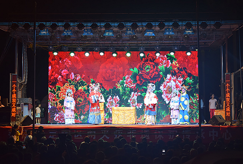 成员们来到舞台前可以看到很精美的舞台,两边有字幕条,可以使不懂得方言的观众更好的理解剧情的内容,同时加上美轮美奂的舞台效果使戏剧得到了升华。使观众更好的深入剧情,体会剧情,理解剧情。