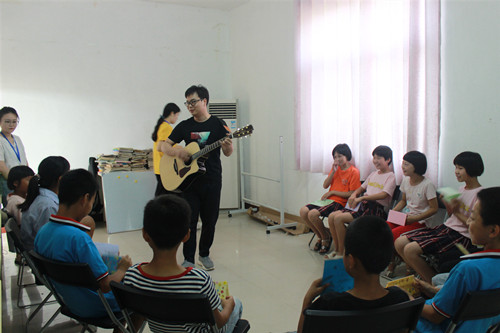 中午午休后,孩子们继续在活动大厅按照自己的进度进行学习,形式与上午相同。在课程之余,各年级部分孩子组织音乐娱乐活动,该活动由今日特来捐献的爱心人士主持进行。活动伊始,老师以弹吉他的形式进行自我介绍并问候大家,紧接着老师组织孩子们进行三项音乐游戏。在游戏中,孩子们非常开心,积极参与其中并与现场老师、志愿者互动。