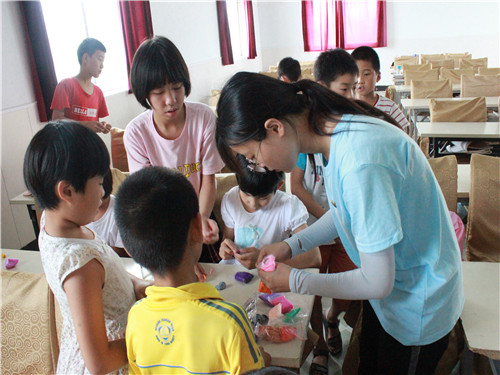 上午,在太阳村副主任童国荣指导下,实践团成员继续辅导孩子学习,在课间准备手工与绘画活动。太阳村绘画室由新乡市爱心企业捐资建立,为让孩子拥有更好的绘画条件,企业还捐赠了完备的绘画设施。今天,画室内还悬挂有企业的爱心寄语,墙壁上则是挂满孩子们的优秀画作。一部分队员带领爱好绘画的孩子在画室学习素描,临摹各类小雕塑。临摹过程中,画室内静谧无声,孩子们专心画着一笔一线,偶尔将雕塑拿起,再轻轻放下,线条渐渐丰盈,图案更加清晰。有的孩子画的慢,队员们便在一旁指导帮助。另一部分队员带领孩子们在活动大厅做手工,用太空泥捏出各种小动物,小建筑。过程中,孩子们与队员相互合作,认真投入,捏出许多栩栩如生的动物形象。