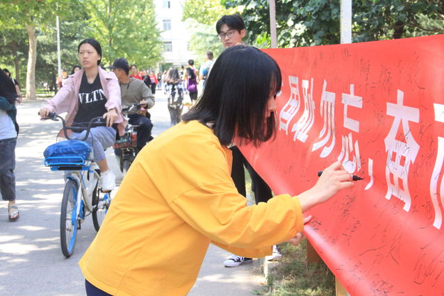 百余名同学们表情严肃,接连在签名横幅上写下了自己的名字,表达自己牢记历史、热爱祖国、勇敢肩负起振兴中华民族重任的坚强决心。