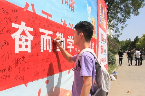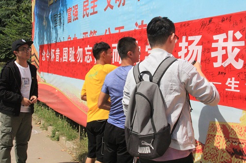 千余名同学们表情严肃,接连在签名横幅上写下了自己的名字,表达自己牢记历史、热爱祖国、勇敢肩负起振兴中华民族重任的坚强决心。