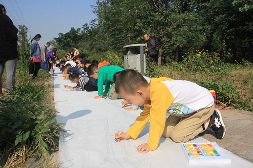 随后,在徐海涛的带领下,大家拿着百米画卷有序来到绘画场地,并将其展开固定于地面。伴着秋风,孩子们和带队老师来到绘画场地,孩子们各个精神饱满,意气风发。接下来,孩子们拿起蜡笔伏在画卷上,虽姿态各异,却都神情专注。活动现场,处处闪耀着孩子们创作的灵感,一面笑,一声赞,声声洋溢着家长们的满意的赞许。飘扬的五星红旗,宏伟的万里长城,雪白的画卷撞上五彩的绚丽,生机勃勃,耳目一新,绘出了属于他们的色彩。另外,志愿者认真的解决且耐心地解答孩子们在绘画过程中遇到的困难。绘画结束后,孩子们在家长和老师的带领下离开。志愿者们将富有浓厚爱国色彩的画卷收起,将场地打扫干净,并合影留念。