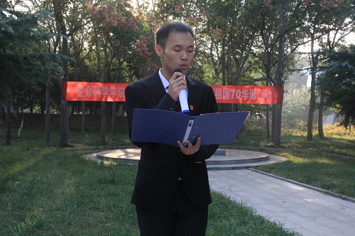 随后,本科生党员代表刘中乾提倡在缅怀先烈,抚今追昔的同时共同践行三个“不能忘记”。一是“不能忘记英雄的不朽功勋”;二是“不能忘记民族的精神气概”;三是“不能忘记青年的情怀担当”。他希望大家牢记习近平总书记对新时代青年人的六点希望,努力成为祖国建设的栋梁之才,为实现中国梦奉献智慧和力量。党员代表李海峰带领全体党员宣誓,声音铿锵有力,充分展现了生命学子的蓬勃朝气与报效祖国,与国共奋进的决心。最后,陈楠楠代表全体成员向祖国送出祝福。祖国七十载,风雨中奋进,祝福我们的祖国更加繁荣昌盛,国泰民安。