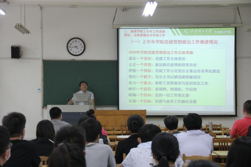 郭万保在总结讲话时梳理了2020年公司党建思想政治工作总体思路,并从政治理论学习、制度建设、过硬支部建设和党员作用发挥等4个方面,回顾了上半年公司党建思想政治工作推进情况。围绕做好暑期及开学初有关工作,他提出四点要求:一要持之以恒加强学习,通过学习更好认清形势、站稳立场、开阔眼界、增强能力、提升素养。二要强力推进工作落实,着力做好人才队伍建设、抓党建突破项目、生工专业认证、“十四五”规划研讨等重点工作。三要千方百计确保安全,落实好暑期公司各项安全工作部署要求,严格做好实验室等场所的安全检查和封闭管理,严格值班纪律。四要遵纪守法照章办事,严格遵守公司和地方疫情防控各项规定,外出严格执行请销假制度;严格遵守政治纪律、廉洁纪律等要求,恪守教师职业道德规范和行为准则,展示良好师德师风。