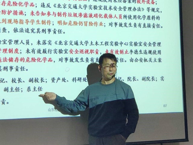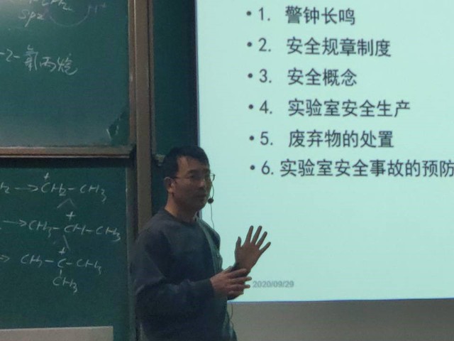 会议伊始,丁忠峰首先介绍了关于进行2020级新生实验室安全教育和实验室准入考试通知的相关内容,告知大家考试时间、合格分数和组织形式等事宜。随后,他从警钟长鸣、安全规章制度、安全概念、实验室安全生产、废弃物处置、实验室安全事故预防和应急处理等共六个方面向大家普及实验室安全的相关知识。