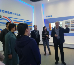 毕玉遂教授首先带领我们参观了新型聚氨酯材料研究院的科技成果展厅,简要介绍了世界聚氨酯发泡剂技术现状,以及他们团队研究开发的新型聚氨酯化学发泡剂CFA8的合成路径、材料优势及应用领域等,并向我们展示了样品。随后毕教授带领我们参观了实验室,并逐步讲解了新型聚氨酯化学发泡剂的合成及制作过程。