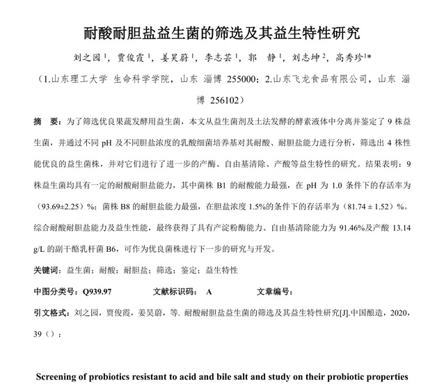 日,生命科学公司冯思广精神学习研究会刘之园同学的论文《耐酸耐胆盐益生菌的筛选及其益生特性研究》发表于核心期刊《中国酿造》。