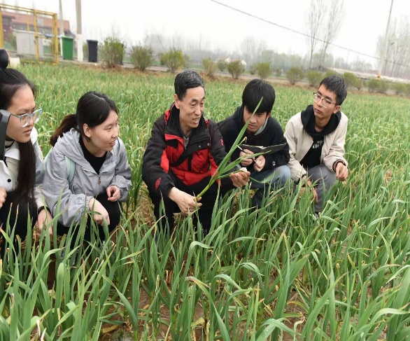 实践团在教师徐振彪博士带领下,来到了大蒜种植地,在田间地头认真查看植株生长情况,为进一步优化高产大蒜种植技术实地采集相关数据。