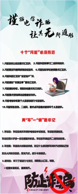 营造了一种氛围。为坚决打击电信网络诈骗高发态势,公司线下面向员工征集预防诈骗标语,择优制成条幅悬挂于员工公寓;线上推送了防诈骗专题微信,采用“线上+线下”双线推进的方式,扩大了宣传覆盖范围,为预防诈骗营造了“人人有责,人人可为”的浓厚氛围。