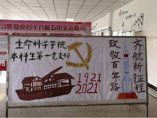 | 通过对淄博市科技馆的参观,党员同志们深受鼓舞。想通过发挥自身专业优势向建党100周年送出贺礼。支部党员同志以及入党积极分子一起收集材料、绘图、打底、裁剪、粘贴、上色、定型,共同将数百片树叶制成展板。展板中的红船是我们党梦想起航的地方,而神舟十二号代表了我国科技事业的腾飞。 |