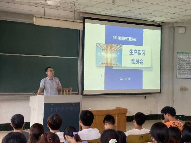 桑锋作动员讲话,首先桑锋就制药工程毕业实习环节对员工实践能力培养的必要性和重要性进行了解读,他要求同学们珍惜本次毕业实习机会,开拓视野,明确方向。叮嘱同学们在实习期间注意安全,服从管理,维护形象,做好实习前准备工作,认真总结实习心得,在实习过程中发扬吃苦耐劳和锐意创新的精神,保质保量完成实习任务并取得优异的成绩。