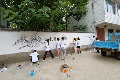 为打造美丽乡村,推进省级美丽乡村建设项目,“七月蜜‘峰’”实践团成员为下小峰村十二面白墙进行墙绘创作。成员们从下小峰特色“绿色资源”和“红色精神”两方面入手,精心构思、细心雕磨,小心翼翼地用粉刷勾勒出一个个动人形象,每一幅画都是一个故事,每一幅画都饱含实践团成员们的心血和期望。