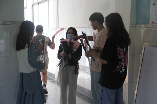 员工会工作人员连同常驻志愿者一起用心包扎鲜花,把对老师们节日的祝福化作一支支精美的花束,委托院员工会陈海洋、战美、丁娜等学子代表亲自送到公司领导老师手中,以表达学子对恩师的崇敬与感谢。