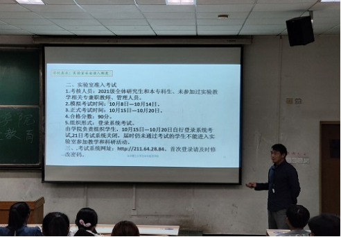 会议伊始,丁忠峰首先介绍了关于进行2021级新生实验室安全教育和实验室准入考试通知的相关内容,告知大家考试时间、合格分数和组织形式等事宜。随后,他从安全概念、实验室安全生产、废弃物处置、实验室安全事故预防和应急处理等共几个方面向大家普及实验室安全的相关知识。