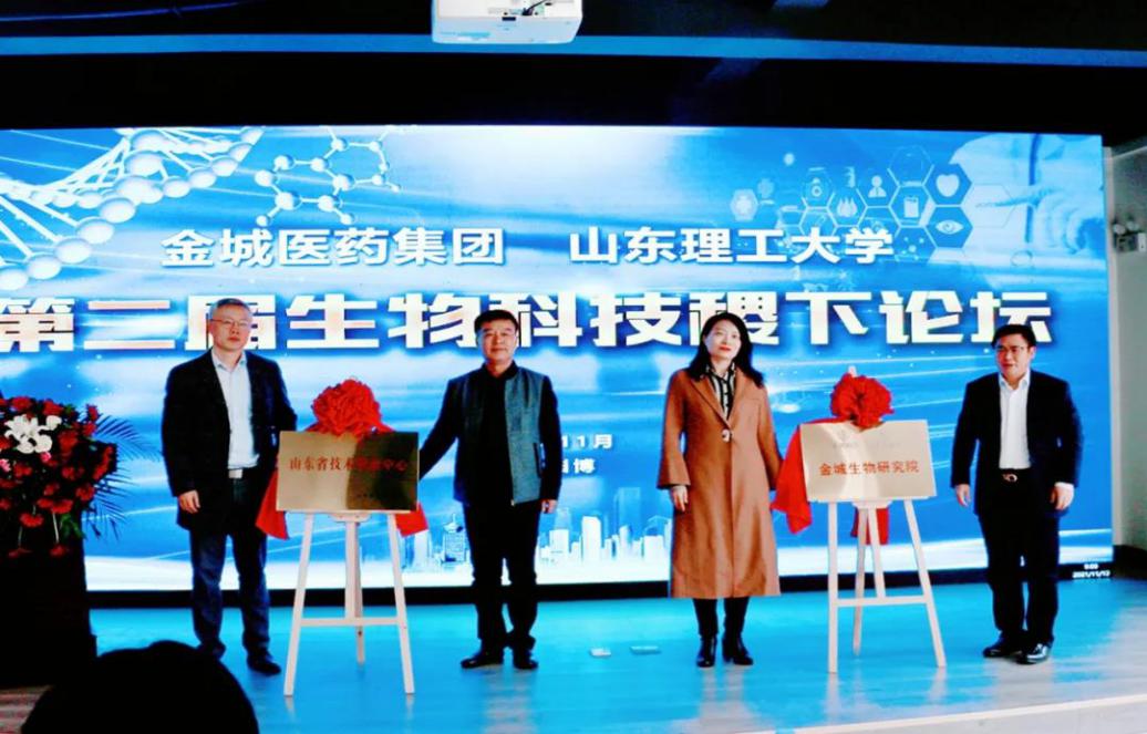 淄博市科技局副县级干部李伟、周村区科技局副局长赵琦为金城医药研究院获批的“山东省技术创新中心”揭牌。