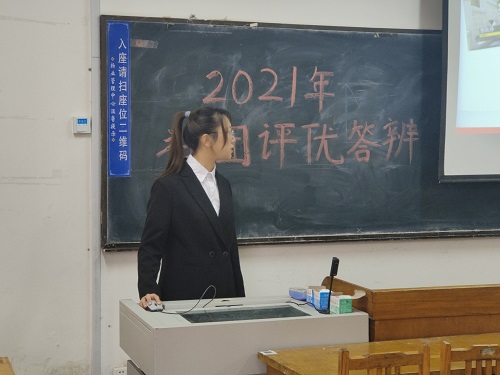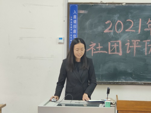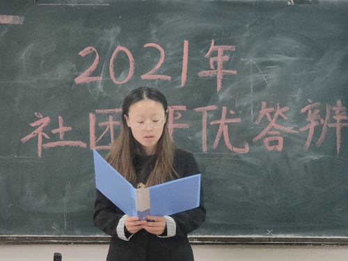 活动伊始,杜金璇对此次活动进行简单介绍。评优活动分为社团答辩和评委打分两个环节。三个社团代表分别运用PPT,从社团建设、社团风采、社团影响以及社团未来展望四个方面进行陈述和展示,展示完毕,评委进行提问,社团工作汇报人答辩。
