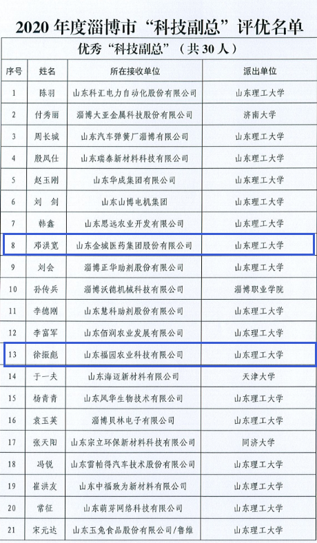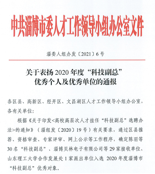 此外,包含马钦元副教授在内,公司邓洪宽副教授、徐振彪副教授均被淄博市科技局评选为2020年度淄博市“科技副总”优秀个人。